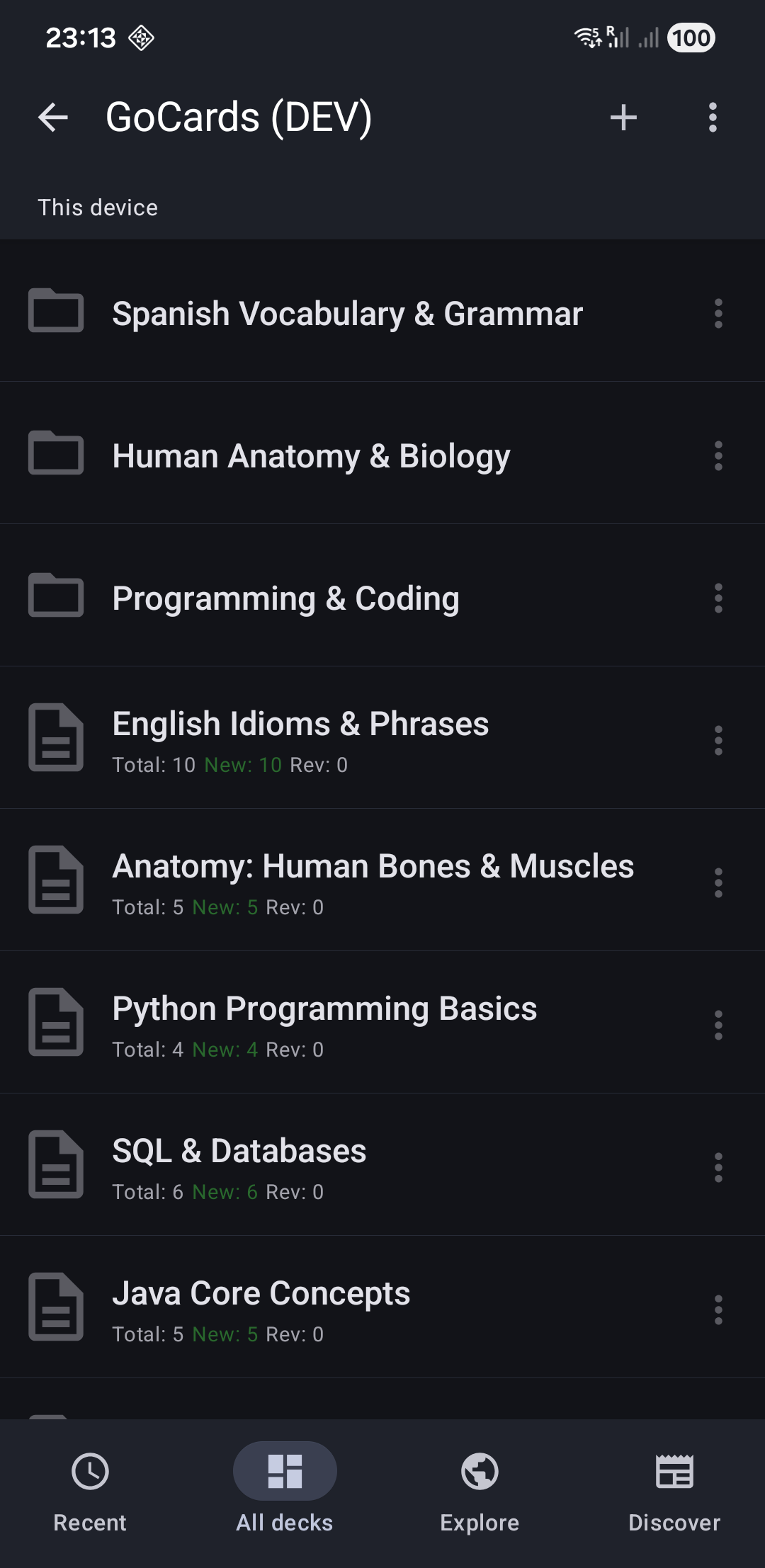 Shows decks you've recently accessed, ordered by last use. This tab helps you quickly jump back into your active learning.