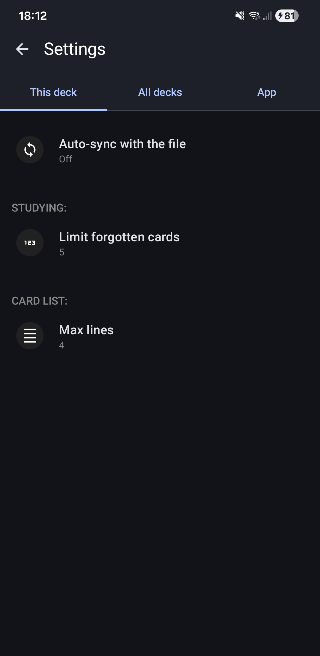 - Or "List Cards" → "⋮" menu → "Deck Settings" (gear icon) Opens Settings screen on "This Deck" tab.